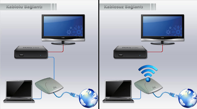 Dünya TV kutunuzu ister wireless adaptör ile kablosuz, isterseniz Ethernet